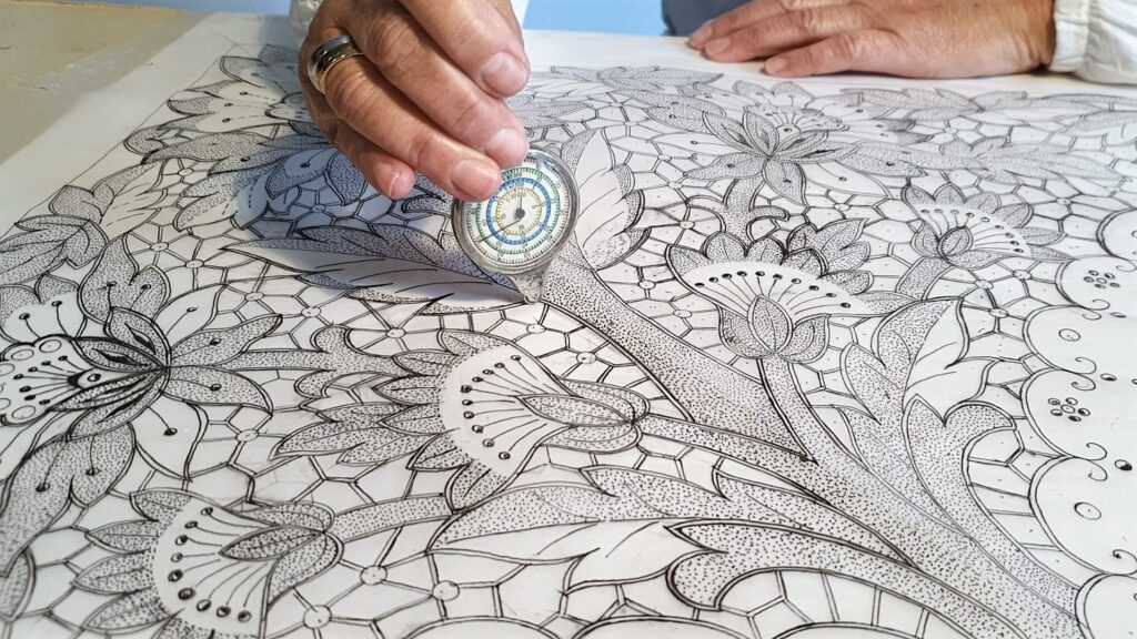 - The final design is transferred onto heavy-duty tracing paper, and the total stitch length is calculated using a curvimeter (a small map measurer).