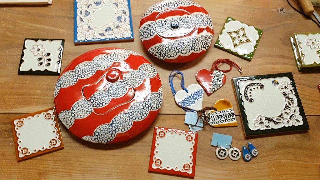Paula and Duarte Gomes, using the aresta technique, have transformed traditional embroidery designs into ceramic tiles.