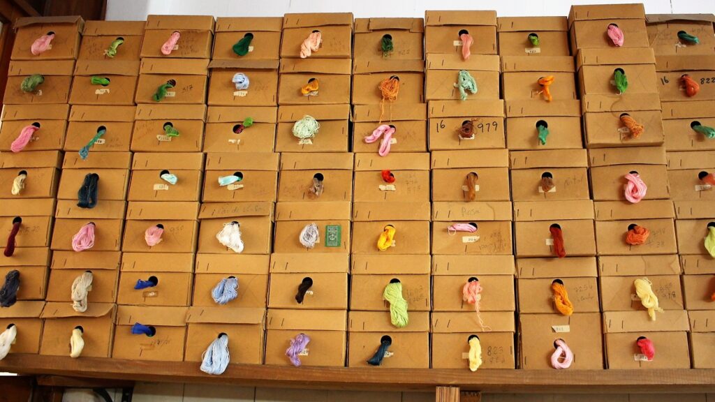 - The stamped fabric and embroidery threads are sent to home-based embroiderers, who meticulously follow the designated stitch types and numbers.